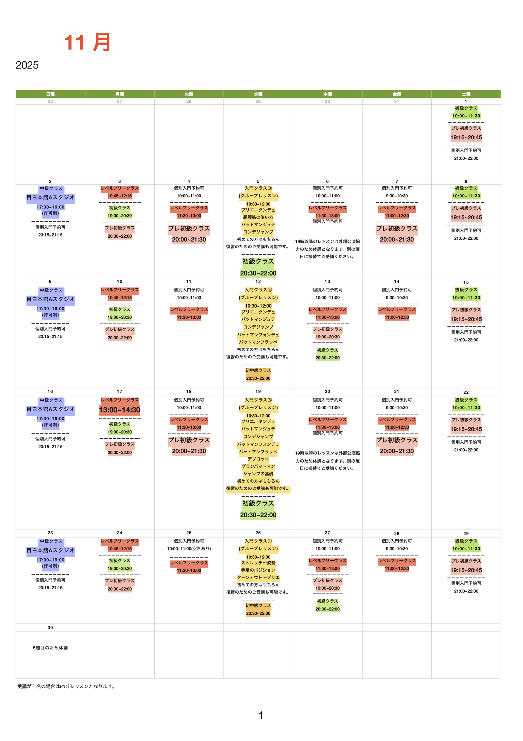 木曜日に外部公演協力のため一部休講がございます。又日曜日17:30の中級クラスの受講は<許可制>に変更になりました。