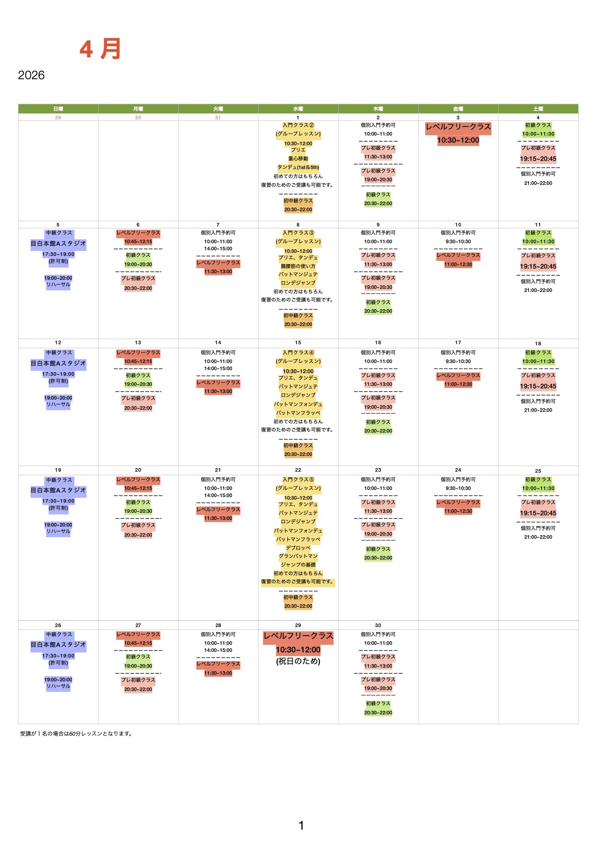 4/29は祝日ですので、10:30のクラスをレベルフリーといたします。